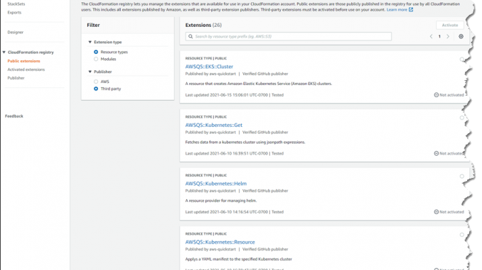AWS, APN 파트너, 서드 파티 및 개발자 커뮤니티에서 게시한 검색 가능한 확장 컬렉션(리소스 유형 또는 모듈)을 제공하는CloudFormation에 대한 새로운 퍼블릭 레지스트리를 발표하게 되어 기쁩니다. 이 레지스트리를 사용하면 AWS 제공 리소스를 사용하는 것과 동일한 방식으로CloudFormation 템플릿 및CDK 애플리케이션에서 이러한 확장을 쉽게 검색하고 프로비저닝할 수 있습니다. 확장을 사용하면 더 이상 서드 파티 공급업체의 리소스 유형에 대한 사용자 지정 프로비저닝 로직을 만들고 유지 관리할 필요가 없습니다. 또한 단일 코드형 인프라 도구인 CloudFormation을 사용하여 AWS 및 서드 파티 리소스를 프로비저닝하고 관리할 수 있으므로 인프라 프로비저닝 프로세스를 더욱 간소화할 수 있습니다(CDK는 CloudFormation을 사용함).