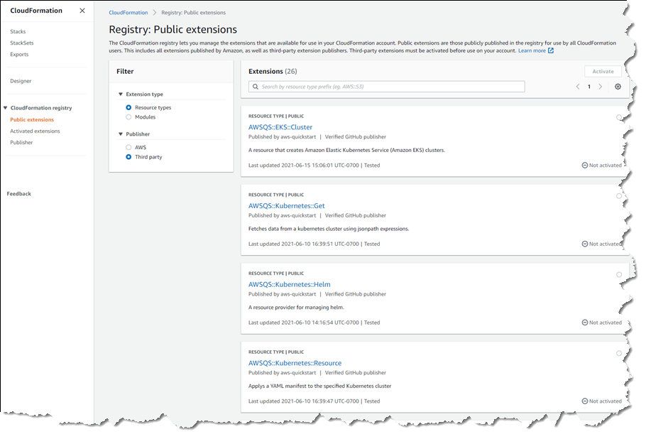 확장 프로그램을 활성화하려면 CloudFormation 콘솔로 이동하여 탐색 모음에서 퍼블릭 확장을 클릭합니다. 이렇게 하면 Registry:Public 확장 프로그램 홈 페이지로 이동되며, 여기에서 서드 파티 리소스 유형 확장 프로그램 보기로 전환합니다.